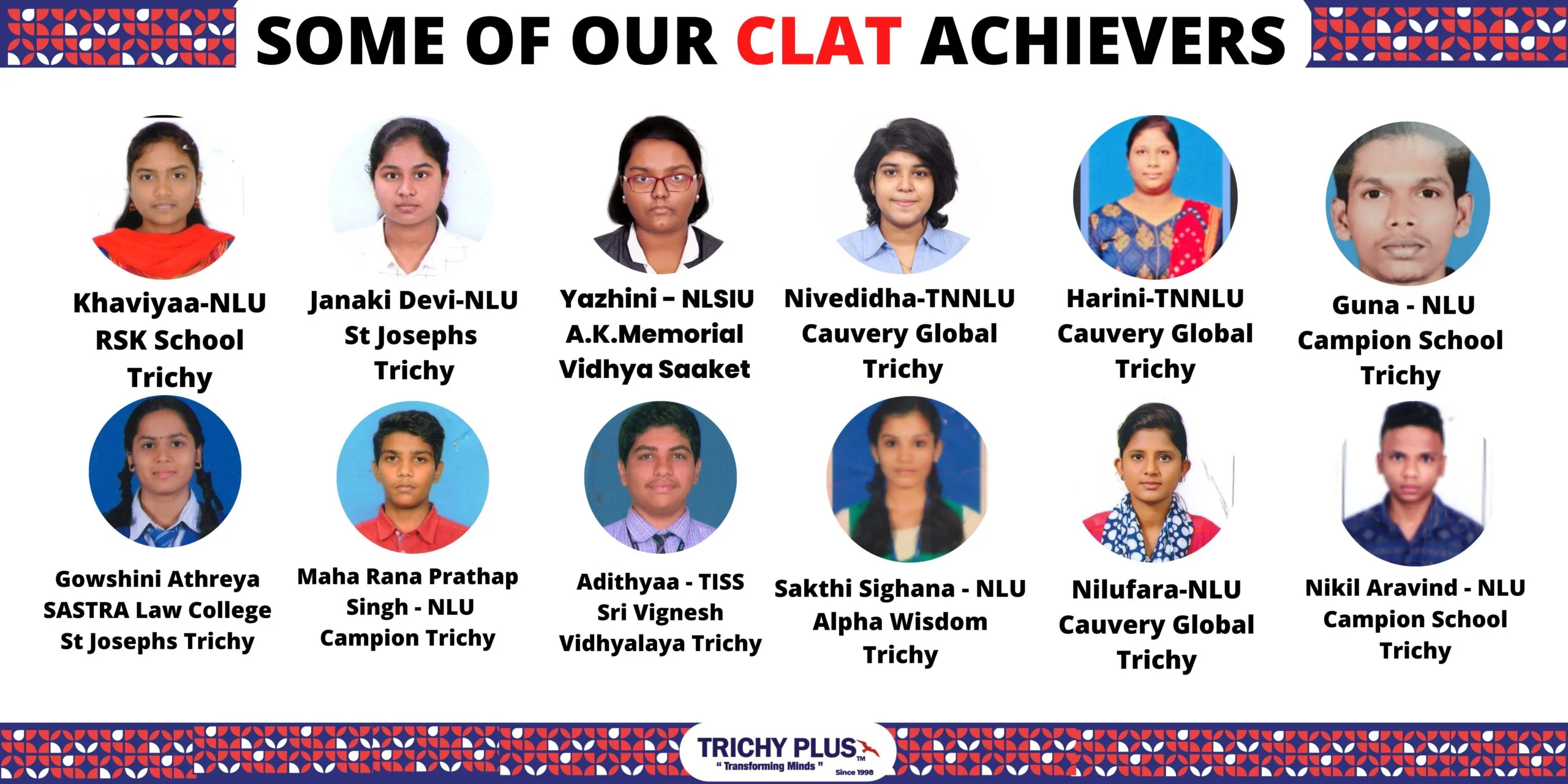 TRICHY PLUS stands out with over 26 years of expertise, a proven track record of top CLAT results, and a team of seasoned instructors. Our state-of-the-art infrastructure, premium study materials, and value-added services like field trips and personality development classes set us apart.