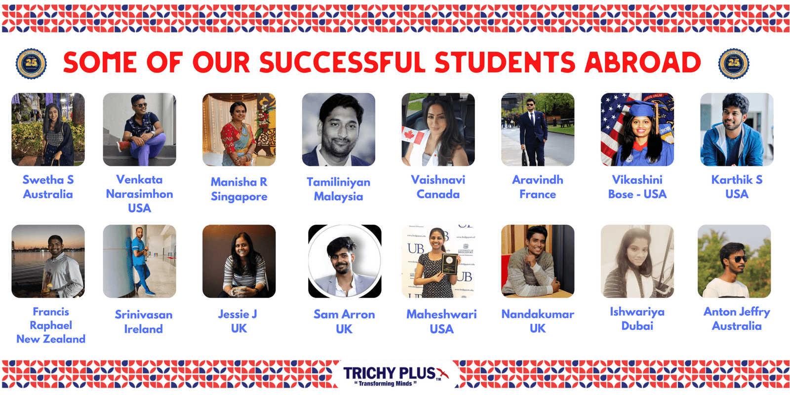 Thank you TRICHY PLUS for guiding me in the right path. I completed my UG from Florida Institute of Technology successfully. We received full support in our Exams Preparation, University Admissions, Documents, Preparation & Visa Process. My elder sister also went for her MS at Univ of New Haven, USA through U2CAN - TRICHY PLUS successfully.